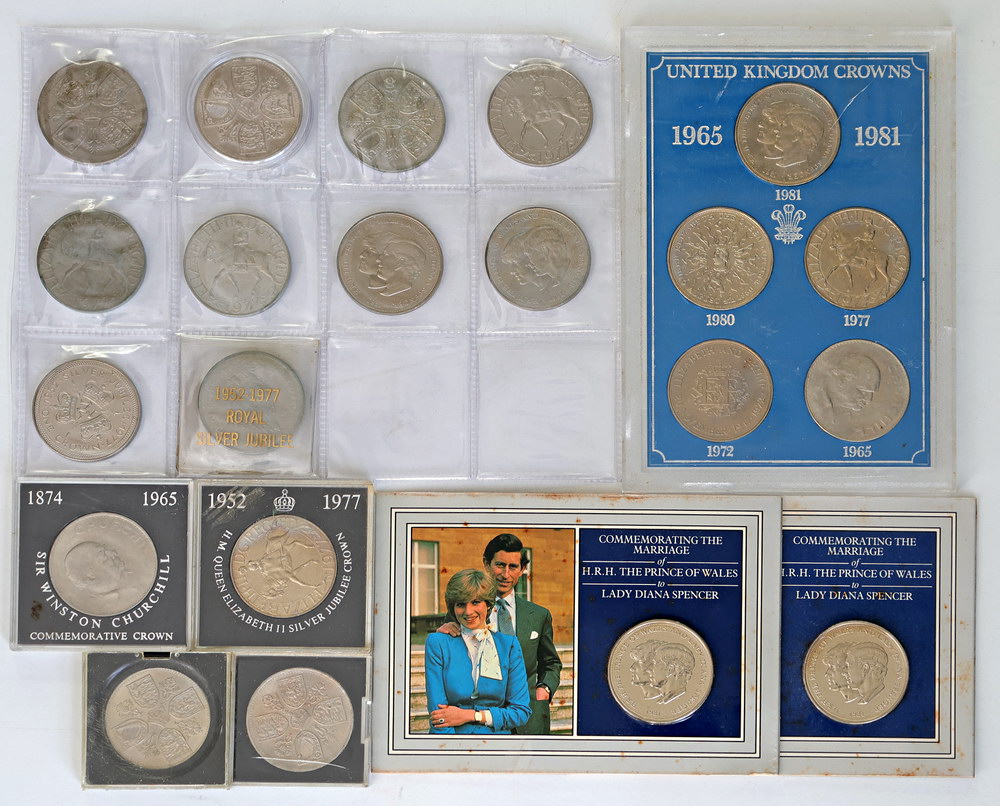 | Description: Commemorative issues: 1965-1981 5-coin set in perspex, 1981 Charles and Di in Royal Mint cards (marks) (2), 1953 (4), 1965, 1977 (4), 1981 (2). Also 1960 standard issue, Isle of Man 1977 and Guernsey 1977. Some in perspex packs. (22 coins/17 items total). EF-UNC |