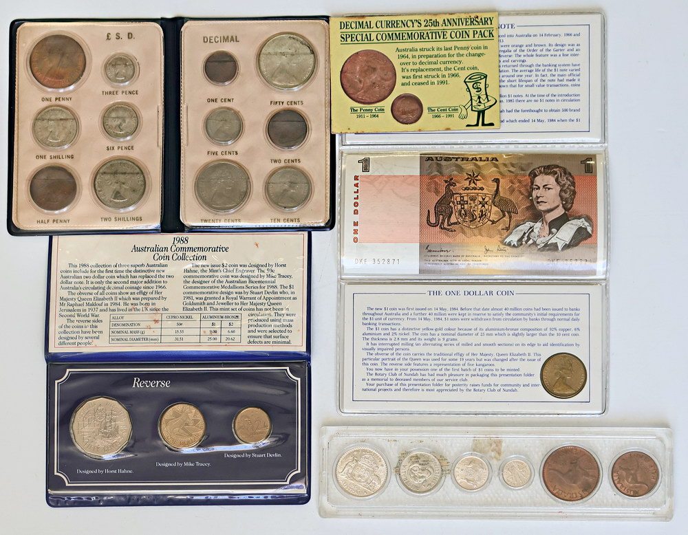 | Description: 1966 Changeover Predecimal and Decimal 12-coin set in blue vinyl souvenir folder, 1963 Predecimal 6-coin type set in Renniks perspex case, 1988 $2/$1/50C 3-coin set in Arnotts pack, 1984 1 Dollar note and coin pack in Rotary pack and 25th Anniversary Decimal Currency 1 Penny and 1 Cent in Downies pack. (5 items total). EF-UNC |