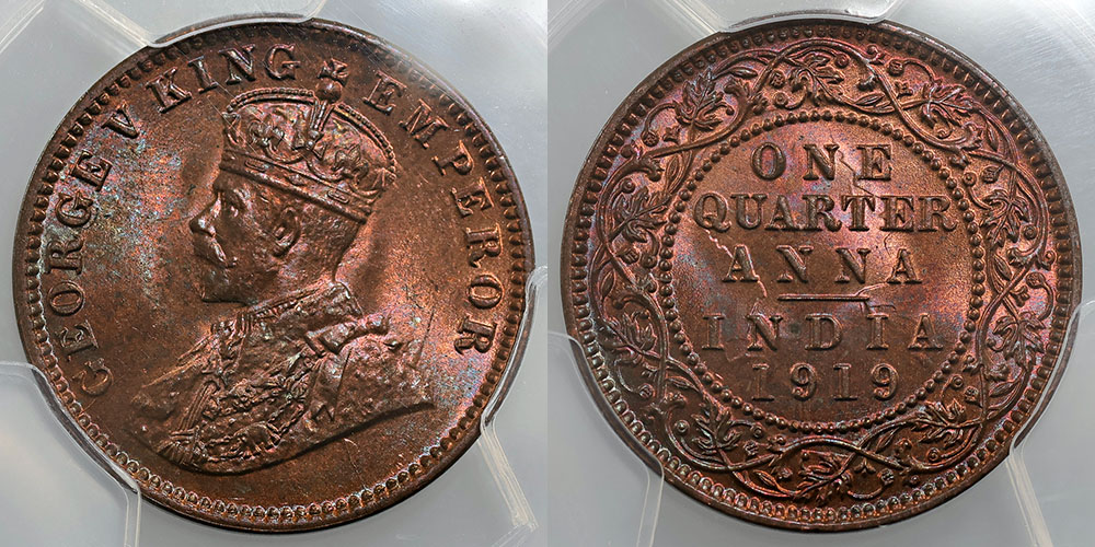 India (British) Quarter Anna 1919 (c). PCGS graded MS 65 RB (81405338). Red/blue lustre.
