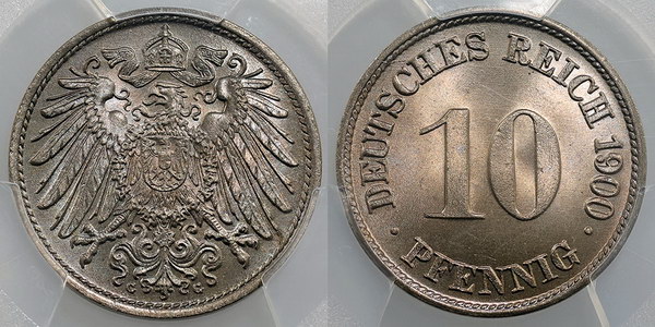 Germany (Empire) 10 Pfennig 1900G. PCGS graded MS 66 (49829927). Light tone with bloom.