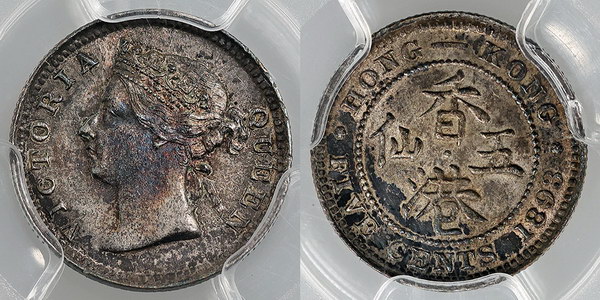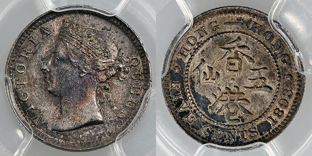 Hong Kong (British) 5 Cent 1893, Victoria. PCGS graded AU 55 (80080632). Dark old toned.
