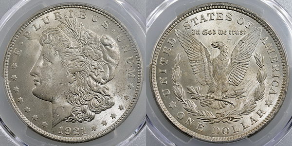 United States silver Morgan Dollar 1921. PCGS graded MS 64 (47497903). Light tone with bloom.