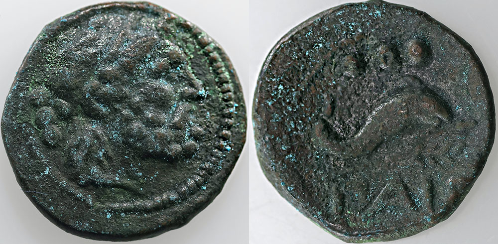 | Description: Ancient Greece Magna Graecia, Lucania (Paestum) under Roman Republic rule copper Quadrans N/D (circa 218-201 BC) (17mm). Obv: Head of Poseidon right, mark of value to left, Rev: Dolphin swims right, mark of value above -?AIS- below. HN Italy 1206. Bold with green patina and historically interesting. Good condition for type and scarce. aVF |