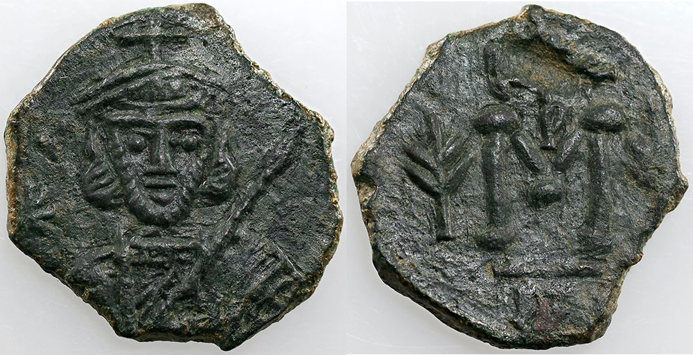 | Description: Ancient Byzantine Empire 30 Year Anarchy, copper Follis Tiberius III Apsimar N/D (698-705 AD) (20mm), Syracuse mint. Obv: Crowned and cuirassed bust facing, cross on crown, holding spear and shield, star left, Rev: Large M, palm either side, monogram above, SCL in exergue (S.1395). Edge clipping else a nice example with clear devices and scarce. aVF/VF |