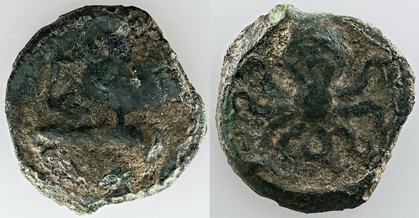 | Description: Ancient Greece, Sicily (Eryx) copper Unit N/D (c 400-397 BC) (11mm). Obv: Female head right, Rev: Octopus. A small and quite innocuous piece, but a quite rare type seemingly unavailable on the market. Typical roughness with a decent patina. Rare. gFINE |