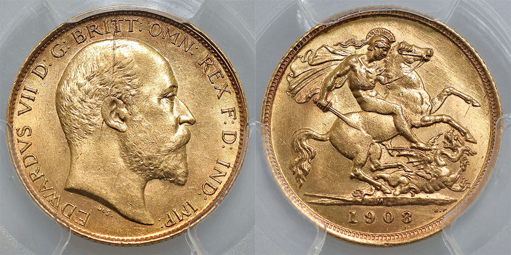 | Description: 1908M St George Reverse. Edward VII. PCGS graded MS 62 (48012764). In the top handfull graded. Scarce. UNC/Ch.UNC |