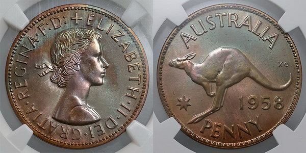 1958 Proof Penny. NGC graded PF 66 BN (2610077-007). Matte brown with some iridescent lustre.