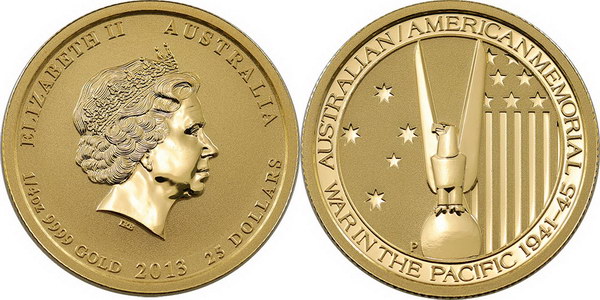 | Description: 2013P War in the Pacific: Australian/American Memorial 1/4 oz gold $25. UNC |