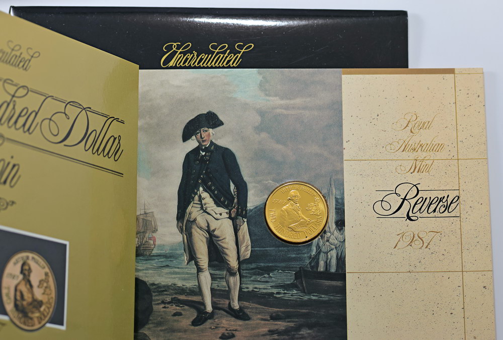 | Description: 1987 Arthur Phillip gold Unc 200 Dollar (10g/22ct). In RAM pack and sleeve of issue. UNC |