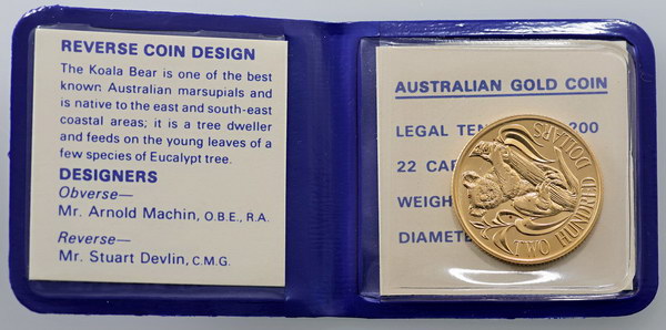 | Description: 1983 Koala gold Unc 200 Dollar (10g/22ct). In vinyl RAM pack of issue. UNC |