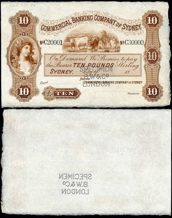 | Description: 18(88) Commercial Banking Company of Sydney 10 Pound specimen, Sydney NSW 18-- (1834-1982). Single-sided colour (brown) specimen, perforated SPECIMEN - BW AND CO - LONDON over signature panel and pencil notation in top left margin -Apr 25 88-. By Bradbury, Wilkinson and Co, London. With tag as sold previously for $28,000. Very rare. aUNC |