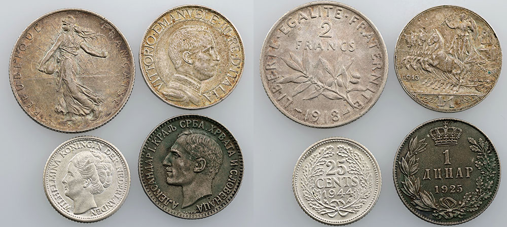 France 2 Francs 1918, Italy 1 Lira 1918, Netherlands 25 Cents 1944, Yugoslavia 1 Dinar 1925. All but the third toned, with some bloom. (4 coins total).