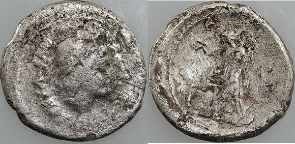 | Description: Ancient Rome Republic silver Denarius 46 BC, moneyer Cordus Rufus (19mm). Obv: conjoined heads of Dioscuri right wearing filleted pilei surrounded by stars, Rev: Verticoia standing left. VG |