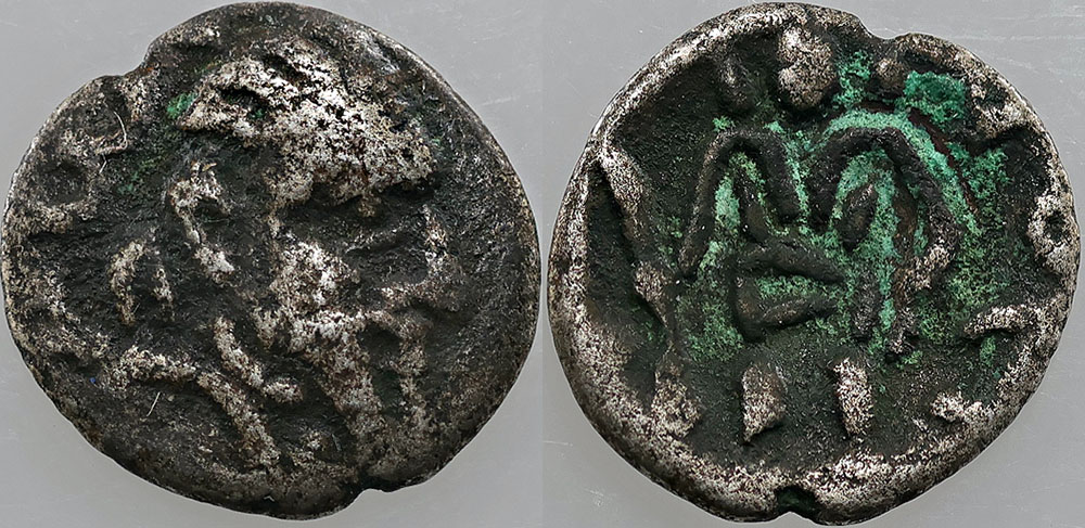 | Description: Ancient Rome Provincial, Indo-Parthian Kingdom Gondophares, Province of Jammu silver drachma N/D (12BC-120AD) (12mm). Obv: diademed bust of bearded king right, Rev: Pallas standing right holding thunderbolt and shield. Mostly dark toned. VG |