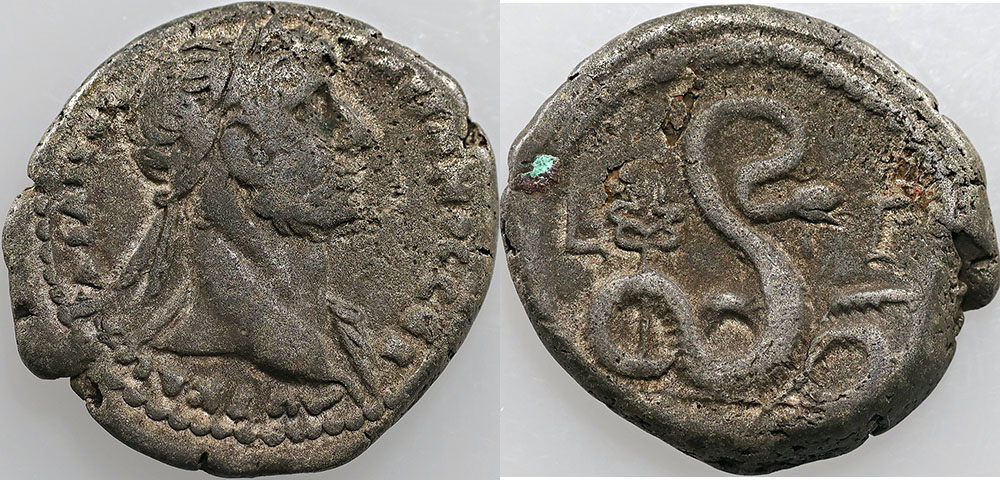 | Description: Ancient Rome Provincial, Egypt Hadrian Emperor billon Tetradrachm N/D (117-118 AD), Alexandra mint (23mm). Obv: laureate bust Hadrian right, Rev: Agathodaemon serpent crowned with pschent enfolding caduceus and ear of corn. Toned. aFINE |