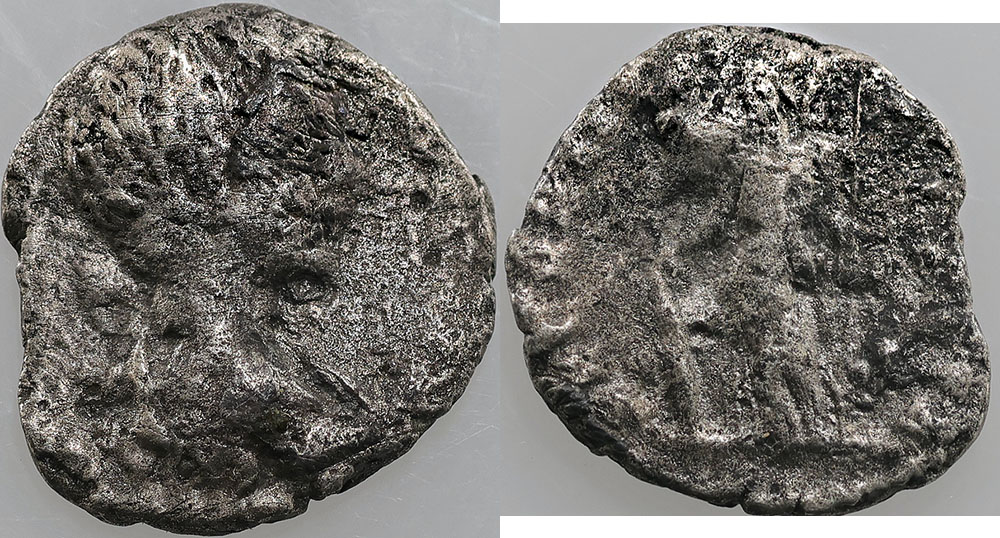 | Description: Ancient Rome Imperial Antoninus Pius silver Denarius 145 AD, Rome mint (16mm). Obv: laureate bust right, Rev: Liberalatis standing left, holding Vexillum and cornucopia. Toned, porous. G/VG |