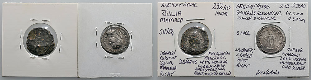 | Description: Ancient Rome Imperial Severus Alexander Emperor silver Denarius N/D (222-235 AD) (19mm). Obv: laureate draped bust right, Rev: Jupiter standing left holding thunderbolt and sceptre. Also Julia Mamaea silver Denarius 232 AD. Obv: Draped bust right, Rev: Fecunditas standing left holding cornucopia and extending right hand to child. Latter dark toned. (2 coins total). aFINE |