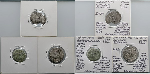 | Description: Ancient Rome Imperial Gordian III Emperor silver Denarius N/D (238-244 AD) (18mm) city of Nicaea in Bythinia. Obv: radiate draped bust right, Rev: three standards with central one with eagle atop, others with wreaths. Also Gordian III as Augustus silver Antoninianus N/D (243-244 AD) (22mm). Obv: Radiate, draped and cuirassed bust right, Rev: Fortuna seated left holding cornucopia and rubber under seat wheel and Gordian III as Augustus silver Antoninianus 240 AD fraction (22x18mm). Obv: radiate, draped and cuirassed bust right, Rev: Virtus helmeted in military dress standing left holding olive branch and spear. (3 coins total). G/VG |