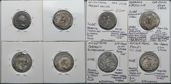 | Description: Ancient Rome Imperial Antoninianus issues; Gordian III (238-244 AD) bust right/Fides standing, Philip I the Arab (244-249 AD) bust right/Aequittas standing left with scales, Trajan Decius (249-251 AD) bust right/Dicia standing left with standard and wolf head, Herennia Etruscilla (249-253 AD) (23mm) bust right hair in straight lines/Pudkitia seated left with veil and transverse sceptre. (4 coins total). VG-aFINE |