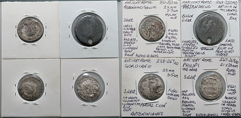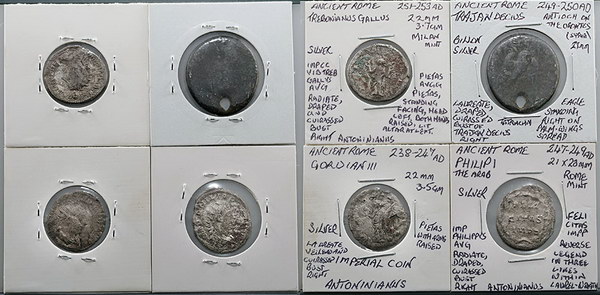 | Description: Ancient Rome Imperial Antoninianus issues; Gordian III (238-244 AD) bust right/Pietas standing, Philip I the Arab (247-249 AD) bust right/legend in 3 lines within wreath and Trebonianus Gallus (251-253 AD) bust right/Pietas standing arms raised. Also Trajan Decius silver Tetradrachm (249-250 AD) bust right/Eagle standing wings spread (holed). (4 coins total). G-VG |