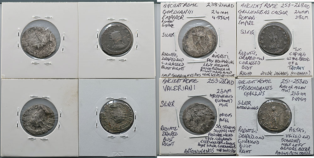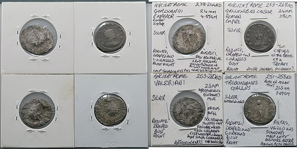 | Description: Ancient Rome Imperial Antoninianus issues; Gordian III (238-244 AD) bust right/Pax advancing (24mm), Trebonianus Gallus (251-253 AD) bust right/Pietas standing left before altar arms raised (21mm) and Valerian I (253-260 AD) bust right/Sol standing left. Also Gallienius as Caesar double Denarius (253-268 AD) bust right/two captives at base pf trophy. (4 coins total). VG-FINE |