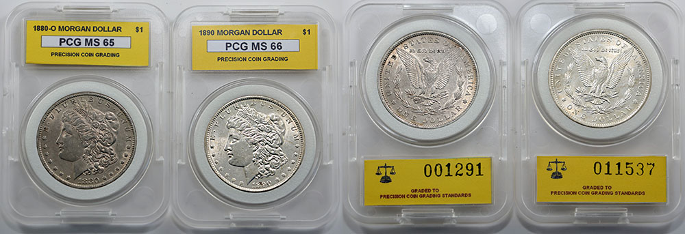 United States silver Morgan Dollars 1880 O, 1890. PCG (Precision Coin Grading) graded MS 65 and 66 respectively. First lightly toned, some marks. (2 coins total).