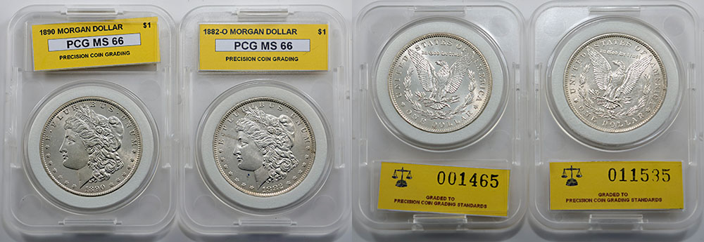United States silver Morgan Dollars 1882 O, 1890. Both PCG (Precision Coin Grading) graded MS 66. Some marks, edge knocks. (2 coins total).