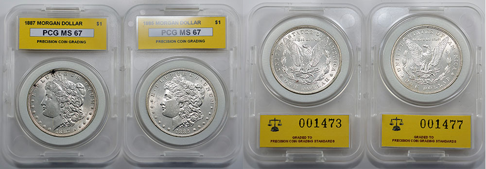 United States silver Morgan Dollars 1885, 1887. Both PCG (Precision Coin Grading) graded MS 67. Some marks, two carbon spots to latter and some bloom. (2 coins total).