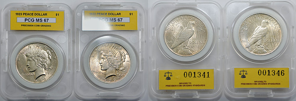 United States silver Peace Dollars 1922, 1923. Both PCG (Precision Coin Grading) graded MS 67. Some marks and light tone. (2 coins total).