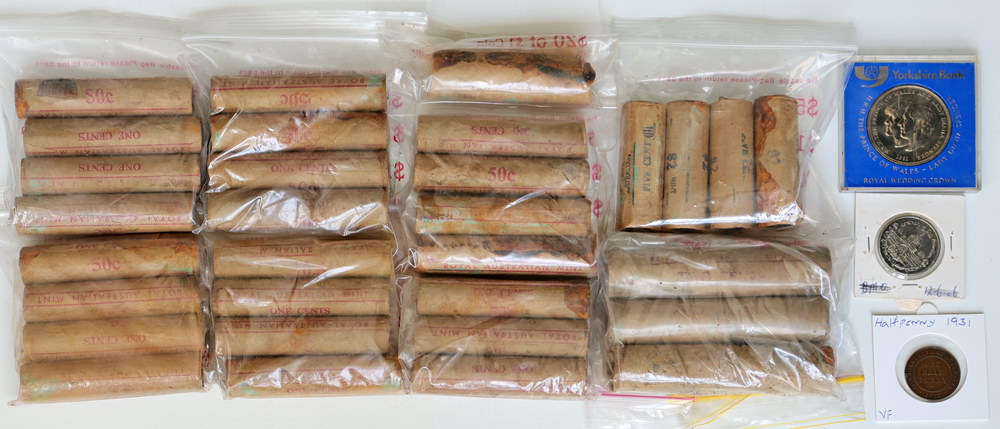 | Description: Small box of mint rolls, includes: 5 Cents 1981 (2), N/D (Rev/Rev) (2), 2 Cents 1980, 1981 (2 and half rolls) and 1 Cent 1979 (2), 1980 (14), N/D (Rev/Rev) (5) RAM mint rolls. Paper damaged and dirty from poor storage, end coins toned. Also 1931 Halfpenny, 2001 Federation 20 Cent and GB Crown 1981 Charles and Di. (34 items total). UNC |