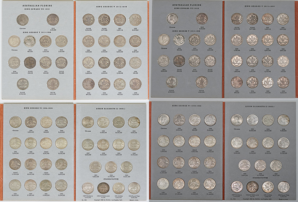 | Description: Florin collection 1910-1964, complete. Includes key date 1932 and all four centenary issues. Most early dates quite worn, some cleaned but a decent set. In Dansco press-in album. (59 coins total). G-aUNC |