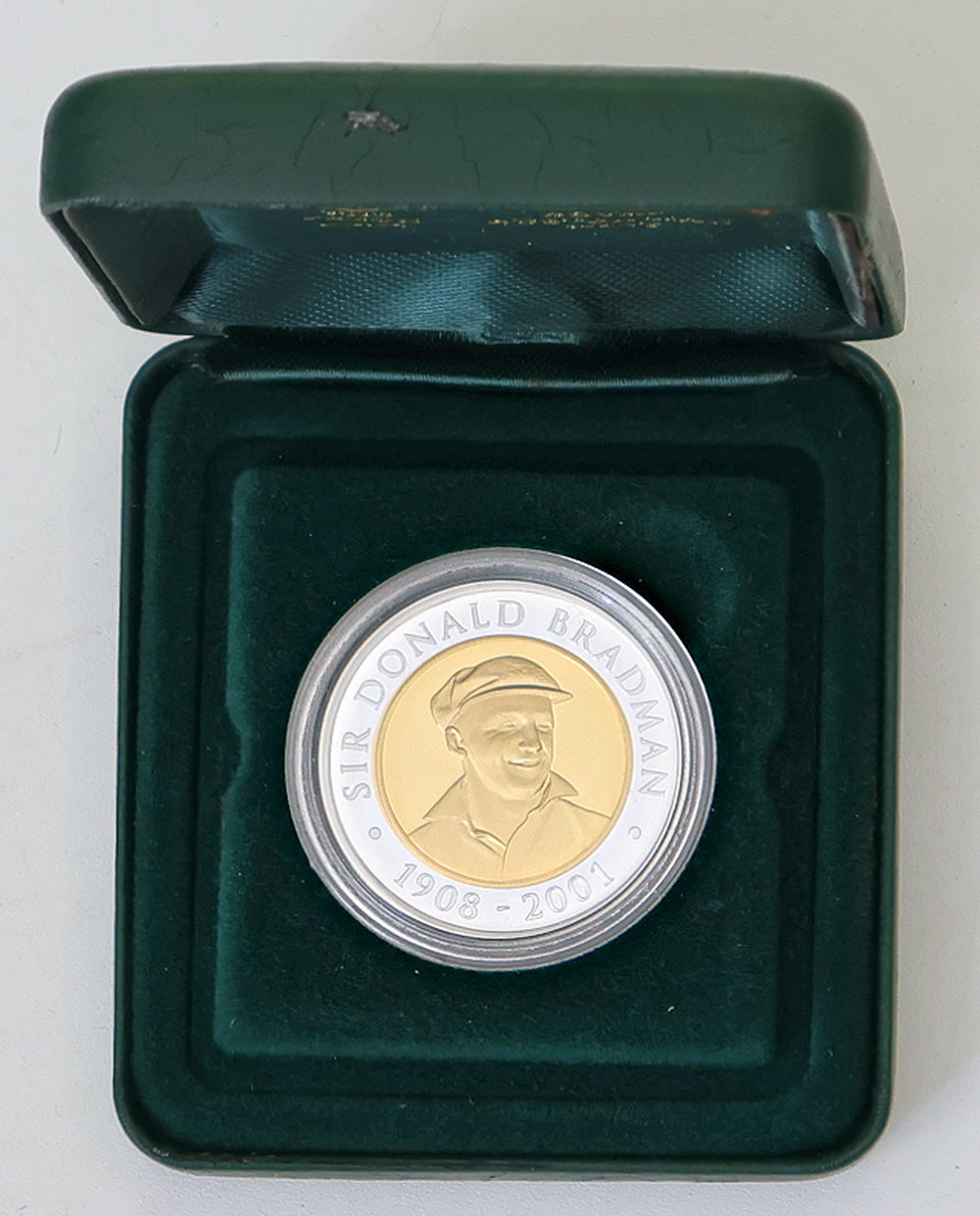 | Description: 2001 Sir Don Bradman bimetal silver/gold Proof 20 Dollar. In case of issue with COA and dust cover (marks/cracking to case). FDC |