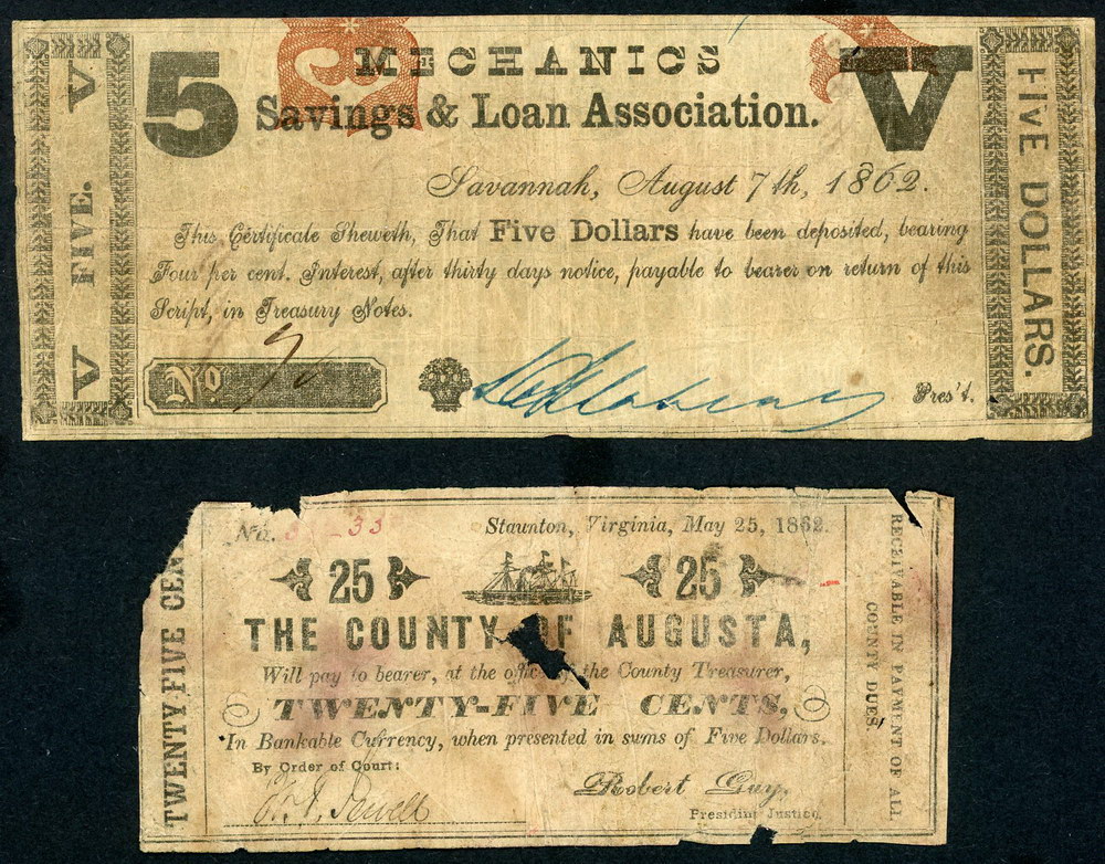| Description: United States Civil War Exchange note for 25 Cents, The County of Augusta, Staunton Virginia 25-5-1862, holes and toned. Also Mechanics Savings and Loan Association Exchange Scrip for 5 Dollars, Savannah Georgia 7-8-1862, No 76, overprinted on uncut and unissued 10 Dollar/Cents paper for Merchants and Planters Bank. (2 notes total). VG/aFINE |