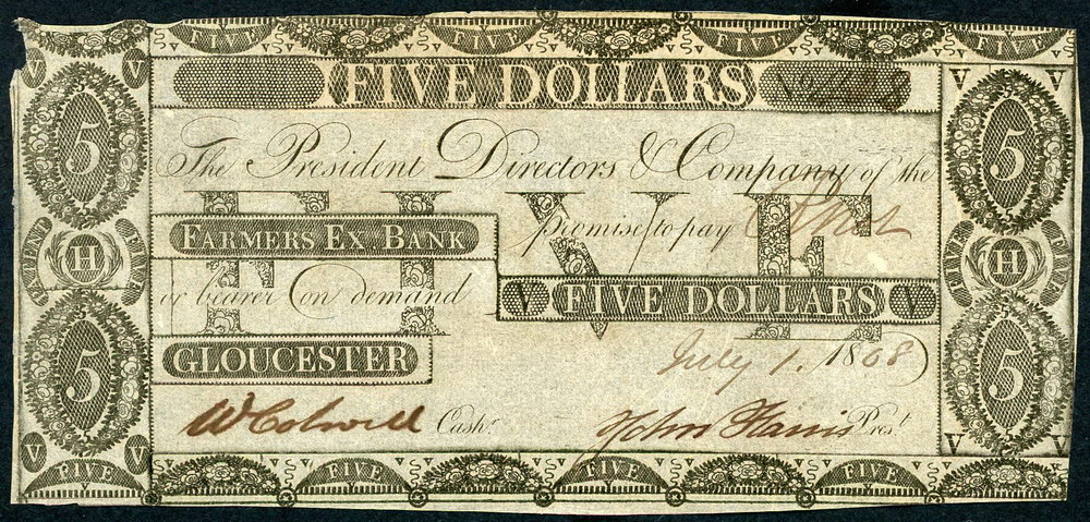 United States Farmers Exchange Bank 5 Dollars, Gloucester Rhode Island 1-7-1808. Small piece missing top left.