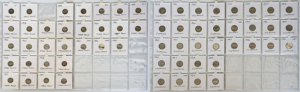 New Zealand Threepence and Sixpence collection, 1933-1965. Missing 1935 Threepence. Mostly toned, a couple cleaned. (62 coins total).