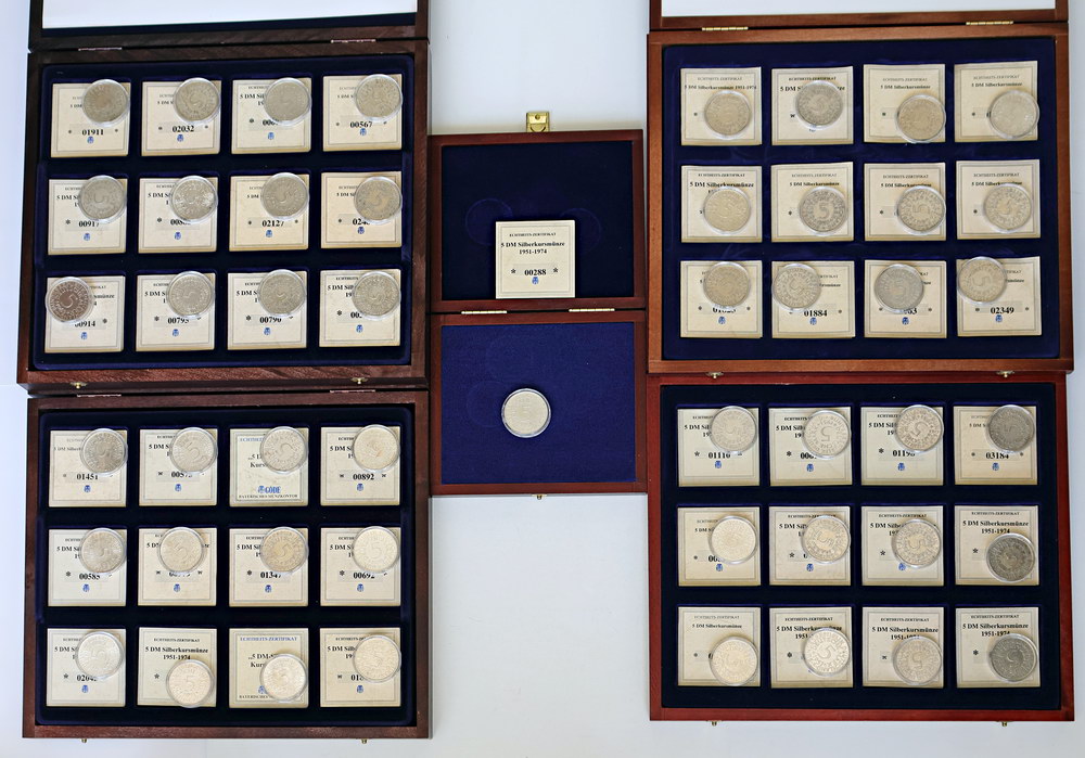 | Description: Germany 5 Marks set of 73 circulation coins 1951-1974. Silver 0.625 (TSW 817.6g). Includes the scarce 1958J. In five plush cases with COAs. (73 coins total). VF-aUNC |