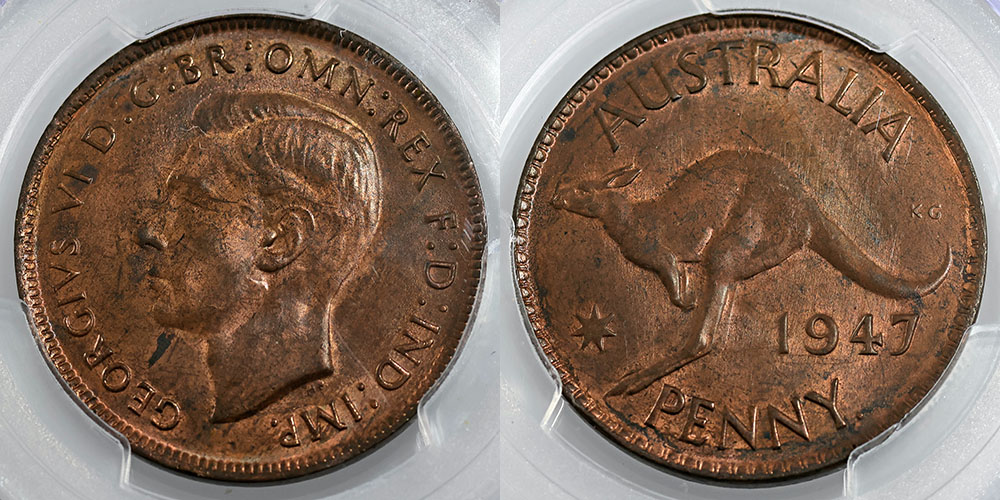 1947Y. PCGS graded MS 63 BN (26347769). Mint red and brown lustre. Scarce.