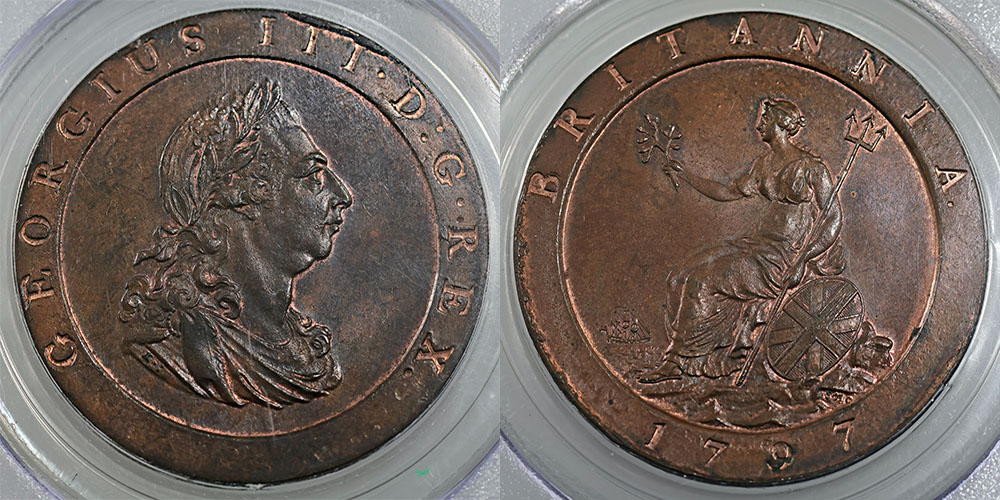 | Description: Great Britain Cartwheel Penny 1797. George III. PCGS graded MS 64 BN (11587904). Brown with hints of bright red lustre, slight edge lip around rim from striking. Very scarce this grade. Ch.UNC/GEM |