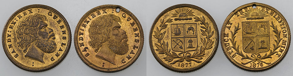 1876-77 Queensland Exhibition medallions, Sandy Ex Rex issues: 1876/3 in brass (holed) and 1877 in brass. Struck at the exhibition mint. (2 medallions total).
