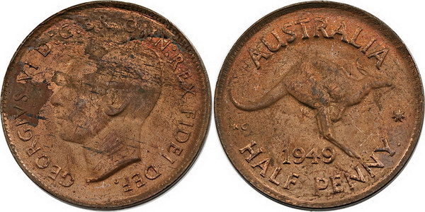 1949Y. Muted reddish-brown with some uneven Obverse toning.