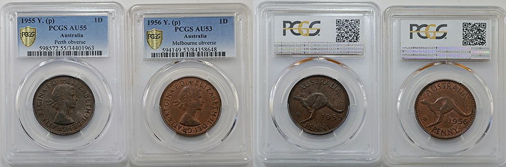 1955Y Perth Obverse, 1956Y Melbourne Obverse. PCGS graded AU 55 and AU 53 respectively (34401963, 84358648). (2 coins total).