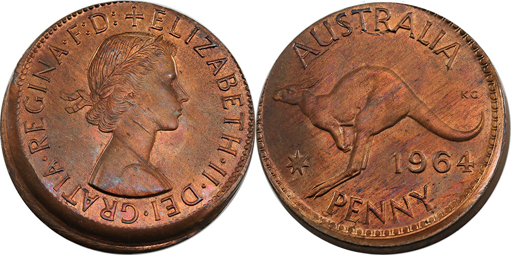 1964. Struck off centre approx 2mm with raised lip. Mint red and brown.