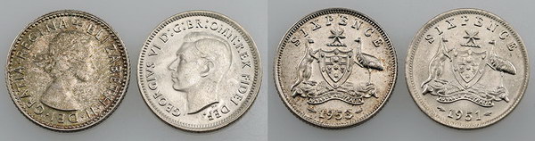 Sixpence. 1948 (2), 1951, 1951PL, 1954 (3),...