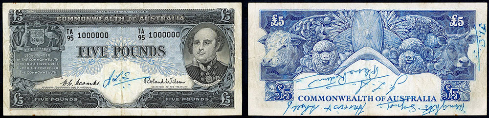 | Description: 1954 Coombs-Wilson (R 49m). Million serial numbers. Serials TA/95 1000000. Folds and a little dirty/soiled, a few minor rust spots with writing in blue ink; JLS on front and on back -JLS, Thoughts, signed Harris and Shelly- JLS - Please Return- but a whole note with good colour. Very rare issue, with specially stamped last digit and only three examples known. aFINE |