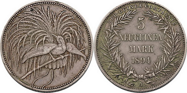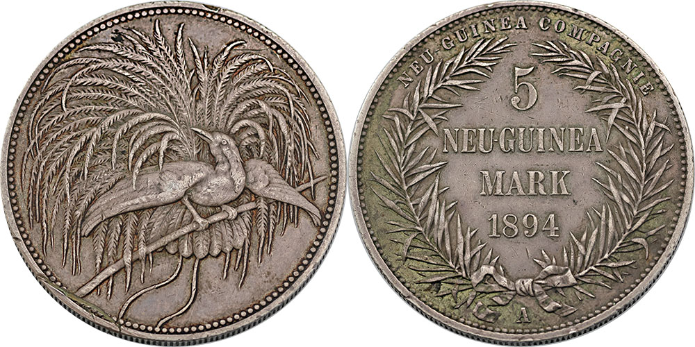 | Description: German New Guinea 5 Mark 1894A. Toned, edge knock and large scrape on Obverse edge with some very slight verdigris tone. Ex Downies Sale 345 Lot 1419. Scarce. VF |