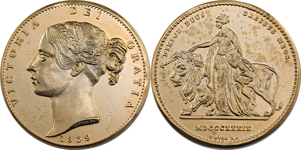 | Description: GB 5 Pound 1839 Victoria gold-plated forgery (21.39g/38mm). Young Head with Una and Lion Reverse. Design a little crude, a few indented points of damage around rim, likely from a clamp or such. Struck by notorious forger David Gee. Rare. As Struck |