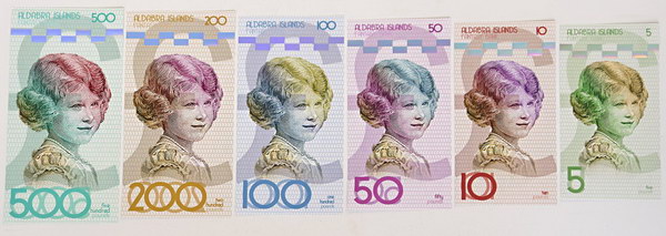 | Description: Aldabra Islands Fantasy 5-note sets, 5 to 500 Pounds. Not legal tender, these fantasy issues feature a portrait of Queen Elizabeth II as a young girl along with the unique wildlife of the Aldabra Atoll, such as birds, giant tortoises, and crabs. (5 notes total). UNC |