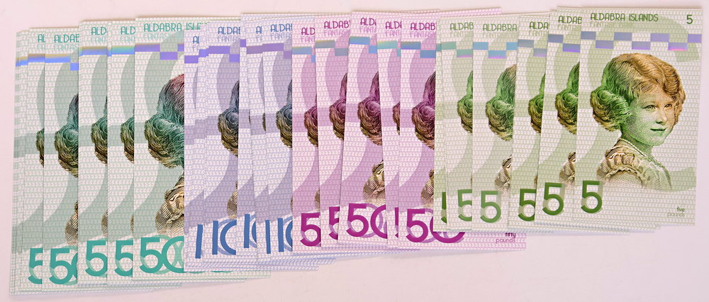| Description: Aldabra Islands Fantasy notes; 5 Pounds (run of 7, trio and single), 50 Pounds (run of 11), 100 Pounds (run of 10) and 500 Pounds (run of 15). Not legal tender, these fantasy issues feature a portrait of Queen Elizabeth II as a young girl along with the unique wildlife of the Aldabra Atoll, such as birds, giant tortoises, and crabs. (47 notes total). UNC |