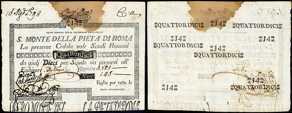Italy Vatican State assignat coupon for 14 Roman Scudi, 16-5-1798. S. Monte della Pieta. Two impressed stamps and common stamp, large stain at top.