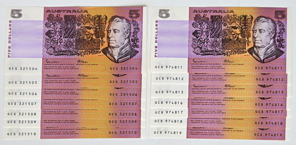 1985 Johnston-Fraser (R 209a). OCRB. Centre fold and handling. Consecutive trio, run of 4 and run of 7. (14 notes total).